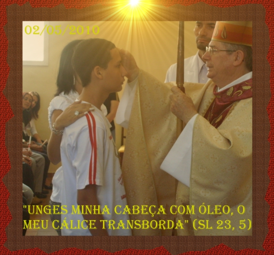 Outro dia marcante para mim foi quando recebi o óleo do Crisma. No dia 02 de Maio de 2010, na Paróquia Sagrado Coração de Jesus, recebi este sacramento da confirmação, e por consequência deste, os dons e o envio do Espírito Santo.